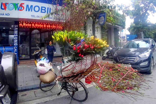 | ជនហាណូយម្នាក់ដឹកមែកផ្កាម៉ាកខៃទៅផ្ទះ។ |