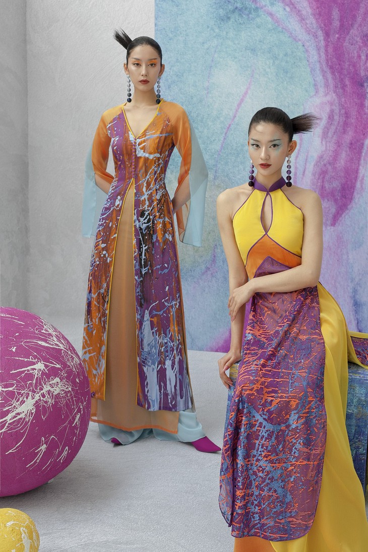 ការប្រមូលប្រើប្រាស់ពណ៌ស្រស់ចិញ្ចែងចិញ្ចាចជាច្រើន សមស្របនឹងជីវភាពមមាញឹកនៅចុងឆ្នាំ។ បាតដៃរបស់វិចិត្រការិនី Thu Tran គួបផ្សំនឹងបច្ចេកទេសជ្រលក់ក្រណាត់ដោយដៃទាំងស្រុង បានបង្កើតឡើង “របាំក្បាច់របស់ពណ៌” នៅលើសូត្រ។