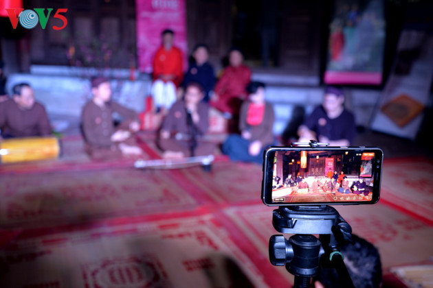 សិល្បករ ចម្រៀង Xoan វ័យក្មេងមួយរូប បានសំដែងនៅទីធ្លាសាលាភូមិ។