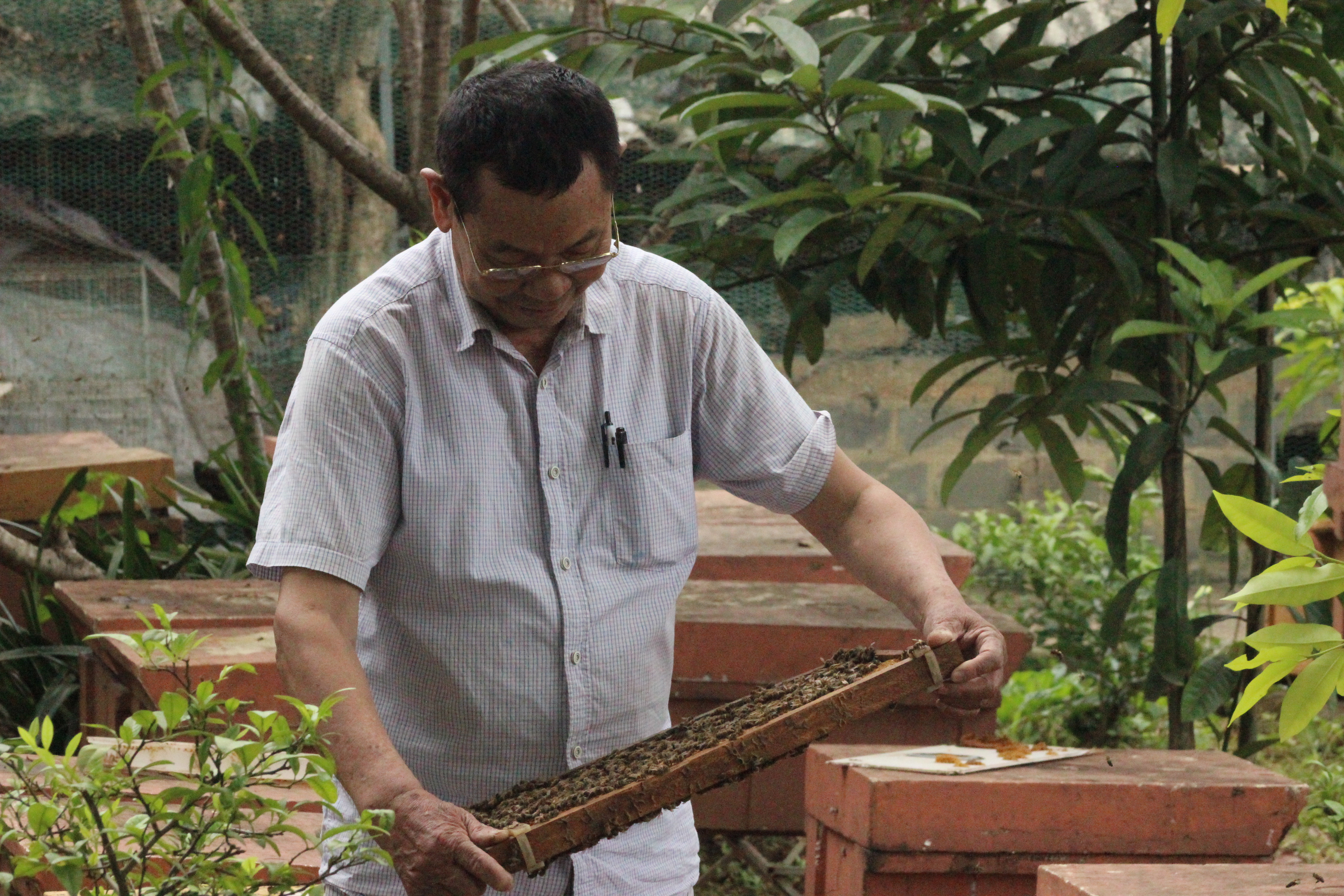 យើងខ្ញុំបានជួបជាមួយលោក Ho Van Sam នៅពេលដែលលោកកំពុងត្រួតពិនិត្យមើលសម្បុកឃ្មុំ។ គួរឱ្យភ្ញាក់ផ្អើលមែនដោយកាលនោះ ឃ្មុំរាប់ពាន់ក្បាលកំពុងហោះជុំវិញដើម្បីការពារសម្បុករបស់ខ្លួន ថ្វីត្បិតតែលោក Sam មិនបានពាក់ខោអាវការពារហើយគាត់គ្រាន់តែស្លៀកពាក់សម្លៀកបំពាក់ធម្មតា ប៉ុន្តែ ឃ្មុំមិនទិចគាត់ឡើយ។ គាត់បានសំណេះសំណាលថា៖ ដោយសារ ឃ្មុំទាំងនេះ គាត់បានចិញ្ចឹមតាំងពីយូរណាស់ មកហើយ បានជាពួកវាស្គាល់ម្ចាស់ហើយវាមិនប៉ះពាល់ដល់អ្នកថែទាំរបស់ខ្លួនទេ។