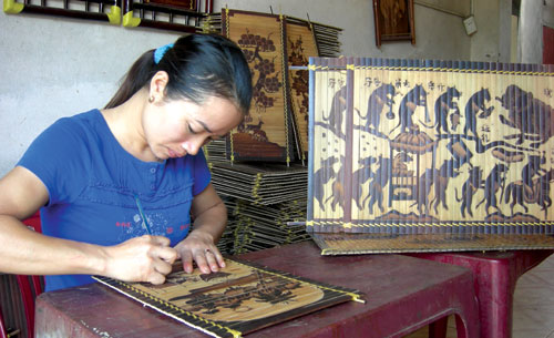 សិប្បករនៅភូមិ Xuan Lai ច្នៃប្រឌិត ឡើង។ គំនូរឬស្សីមានពណ៌លឿង