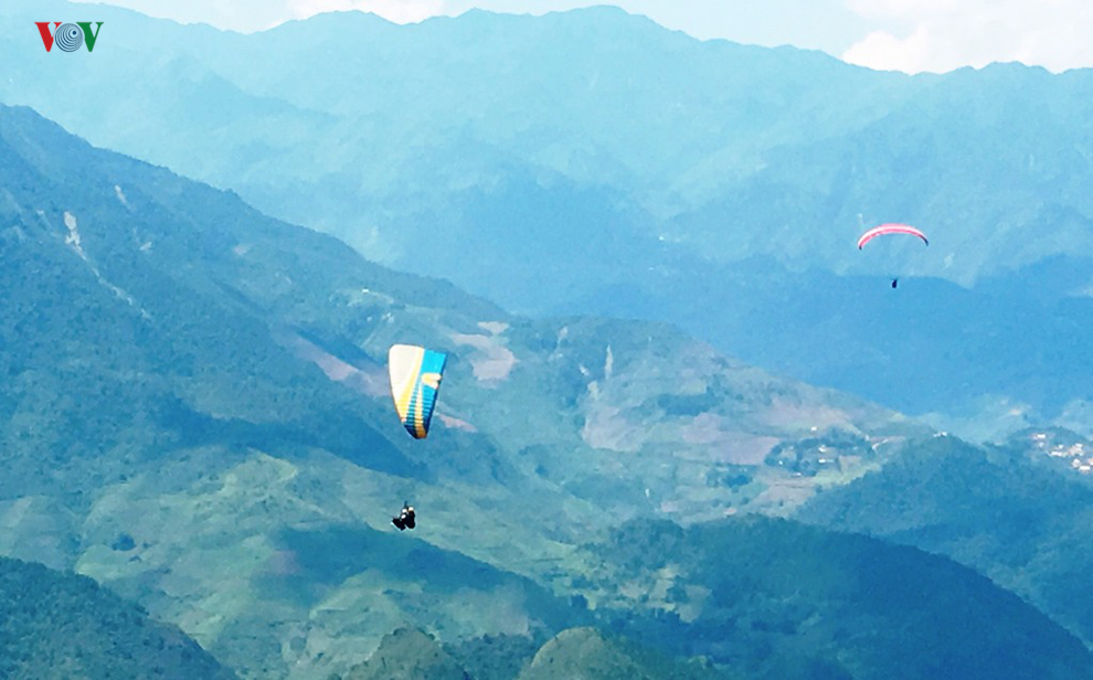 នកលេងកីឡាជិះឆ័ត្រយោង ហោះនៅវៀតណាមតែងតែជ្រើសរើសតំបន់ព្រៃភ្នំ ដែលមានទេសភាពធម្មជាតិដ៏ស្រស់បំព្រង ដើម្បីពេលជិះឆ័ត្រយោងក្នុងអាកាសអាច គយគន់ព្រៃឈើខៀវស្រងាត់ វាលស្រែកាំជណ្ដើរពណ៌លឿងមាសក្នុងរដូវស្រូវទុំ (រូបថត៖ VOV)