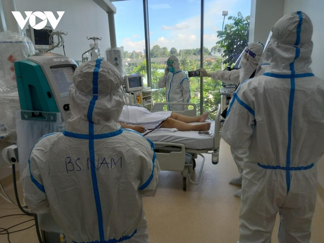 ក្រុមវេជ្ជបណ្ឌិតកំពុងព្យាបាលសម្រាប់អ្នកជម្ងឺកូវីដ ១៩ ដ៏ធ្ងន់ធ្ងរម្នាក់នៅជាន់ទី៥ ក្នុង ទម្រង់ព្យាបាល៥ជាន់។ (រូបថត៖ VOV) |