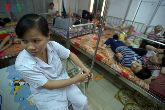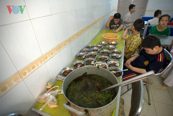 | បណ្ដាកម្មាភិបាល បុគ្គលិកនៅបុរីកុមារ Hoa Binh ធ្វើការងាររបស់ខ្លួនដោយទឹកចិត្ត ស្រឡាញ់មេតាធម៌និងស្មារតីទទួលសុខត្រូវ។ គេត្រូវធ្វើការ ៣ វេន ក្នុងមួយថ្ងៃ ដើម្បី ថែទាំគាំពារកុមារាកុមារីពិការទាំងនេះ៕ |