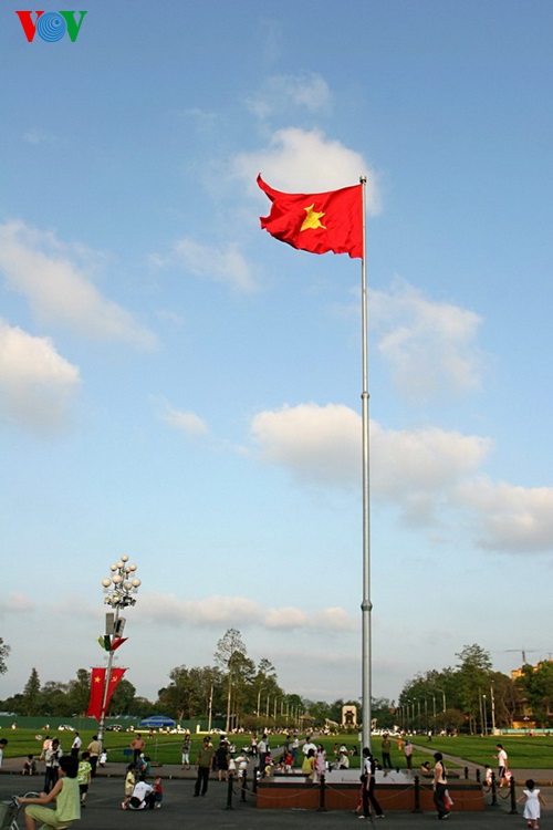 | ពិធីដង្ហូតទង់ជាតិចុះប្រព្រឹត្តទៅនៅវាលាម៉ោង ៩ យប់ជានាប្រចាំថ្ងៃនៅទីលាន Ba Dinh៕ |