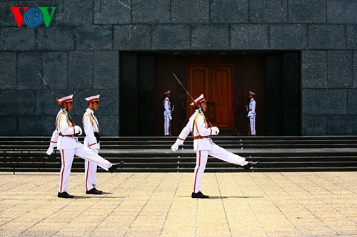 | ការផ្លាស់វែនយាមមួយរបស់បណ្ដាយុទ្ធជននៃមេបញ្ជាការដ្ឋានការពារប្រាងតម្កល់សព លោកប្រធានហូជីមិញ។ |