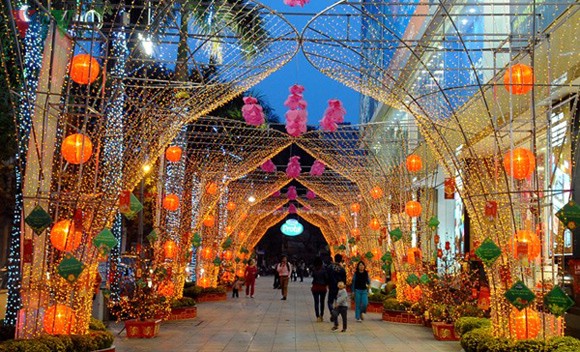 ចញ្ចើមផ្លូវនៅមណ្ឌលពាណិជ្ជកម្ម Vincom ត្រូវបានតុបតែងដោយអំពូលអំពូល អគ្គិសនីចម្រះព័រ ។