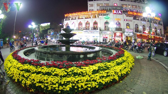 ស្តូបបាញ់ទឹកនៅបឹង Hoan Kiem ត្រូវបានតុបតែងដោយផ្កាស្រស់។