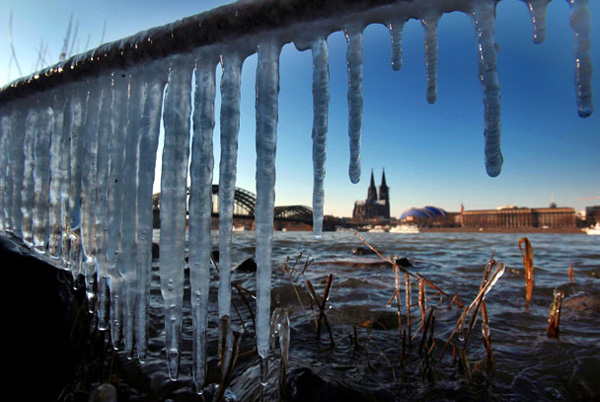 2. អាចុតសិលាពីព្រិលកកក្រាស់លើបង្កាន់ដៃស្ពានមួយឆ្លងទន្លេ Rhine នៅទីក្រុង Cologne ភាគខាងលិចអាលឹ្លម៉ង។ (រូបថត: EPA)
