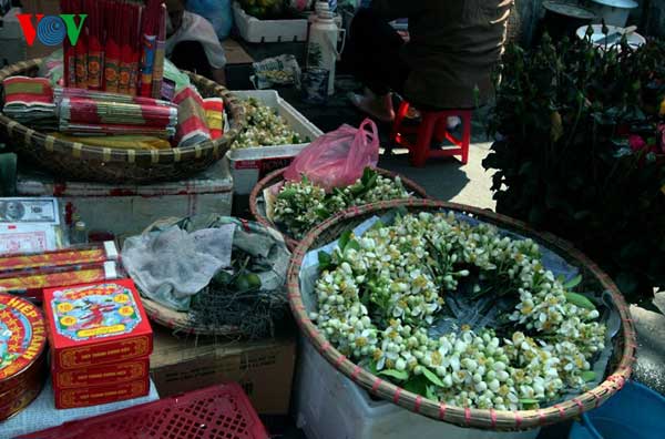 | ស្ទង់លក់ផ្កាក្រូចថ្លុងនិងគ្រឿងសំណែននៅវិថី Hang Khoai ទីក្រុងហាណូយ។ |