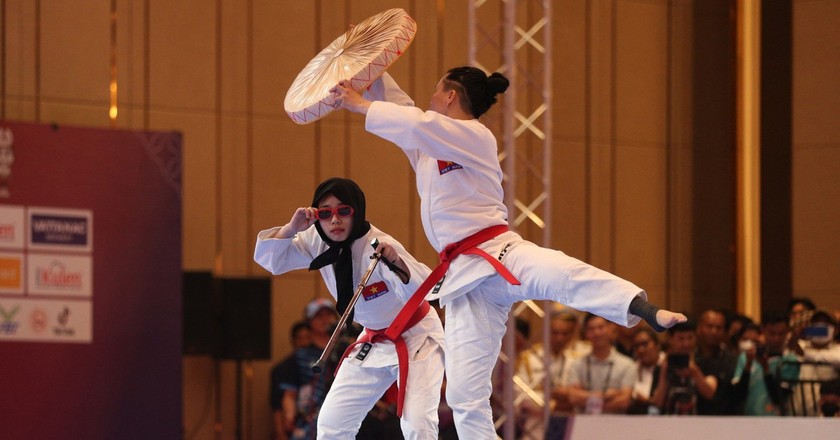 កីឡាការិនីវៀតណាម Hoang Thi Lan Huong និង Nguyen Minh Phuong បានធ្វើឲ្យទស្សនិកជនមានការចាប់អារម្មណ៍ នៅពេលនាំមួកដួន quai thao និងកន្សែង ចំពុះក្អែកចូលក្នុងការប្រកួតរបស់គេ។ |