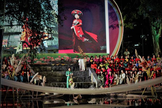 ‘아오자이 주간’행사에 호응해 350명의 꼰뚬성 여성연합회원들이 다같이 아오자이 컬렉션을 공연했다. (사진 출처: 베트남 통신사) |