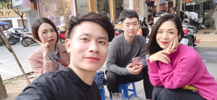 2019년 뚜언 전씨가 VOV5 동료들과 하노이 길거리에서 차를 마시고 있는 모습 |