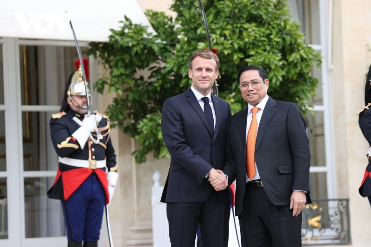 2021년 11월 프랑스 공식 방문 중 팜 민 찐 총리와 프랑스 에마누엘 마크롱 대통령 [사진: VOV] |