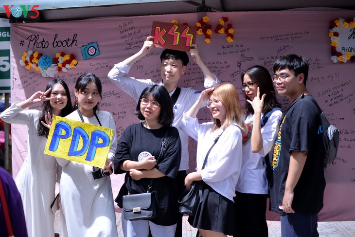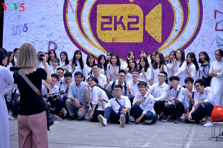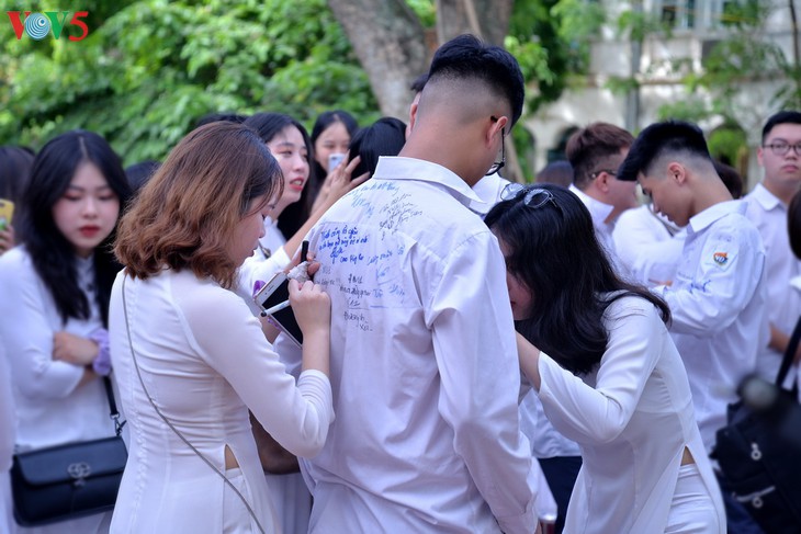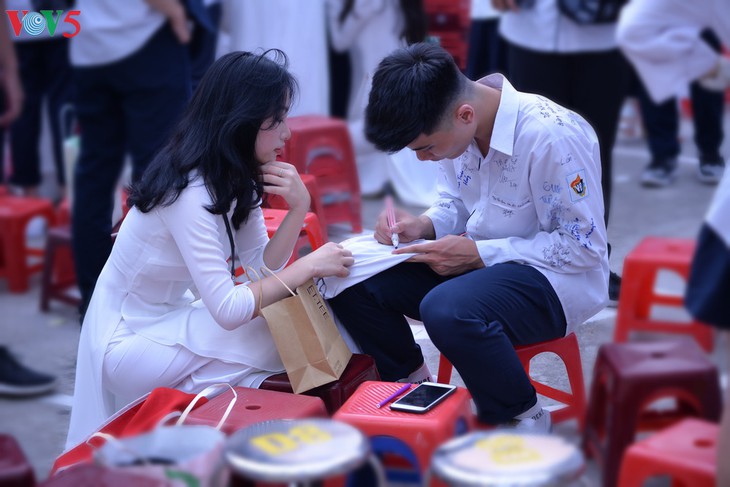 | 비엣득학교 운동장의 뒷 배경은 정든 교정을 떠나는12 학년 학생들의 소원을 담은 수천 개의 서명을 담고 있다. |
