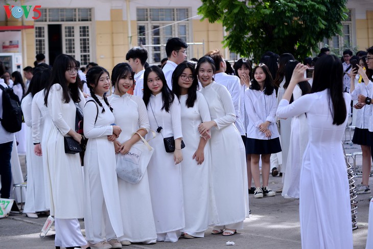 | 학생들은 일찌감치 학교에 나와 순수한 흰색 아오자이를 입고 행사에 참석했다. |