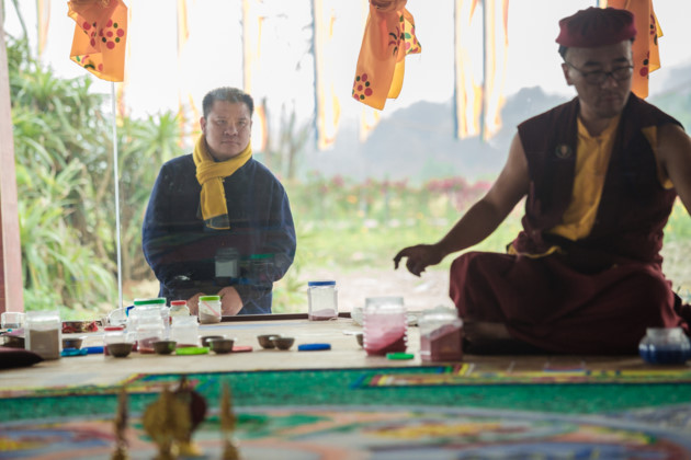 | 불화는 Tay Thien 만다라 대보탑의287m2의 전시장 면적에 9일 동안에 Drukpa 계파의 고승들의 능숙한 손으로 만들어진다. |