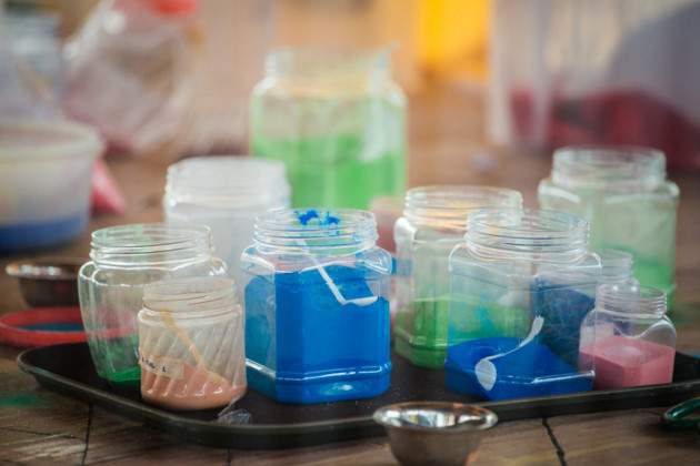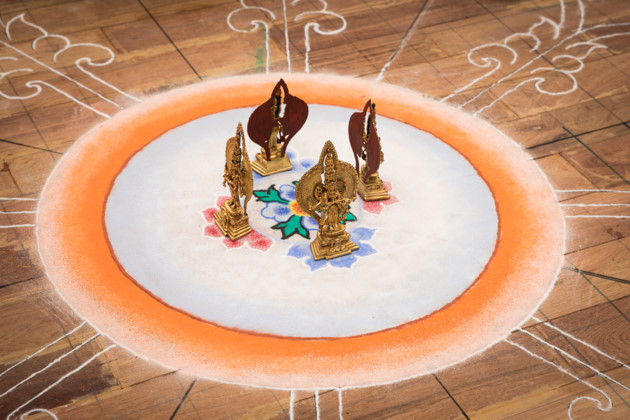| 승려는 만다라의 중심에 보석을 모은다. 만다라 보석의 대부분을 항아리에 넣고, 실크로 싸서 근처에 바다, 강과 시내에 쏟아부음으로써 전세계적으로 활력이 퍼져 환경을 치유하고 기후가 온화하도록 비는 뜻이다. |