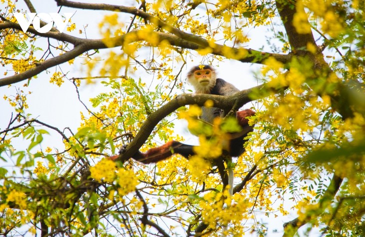 | 아름답게 피어 있는 림쌧 나무 사이에 움직이는 갈색정강이두크가 관광객의 관심을 끌고 있다. |