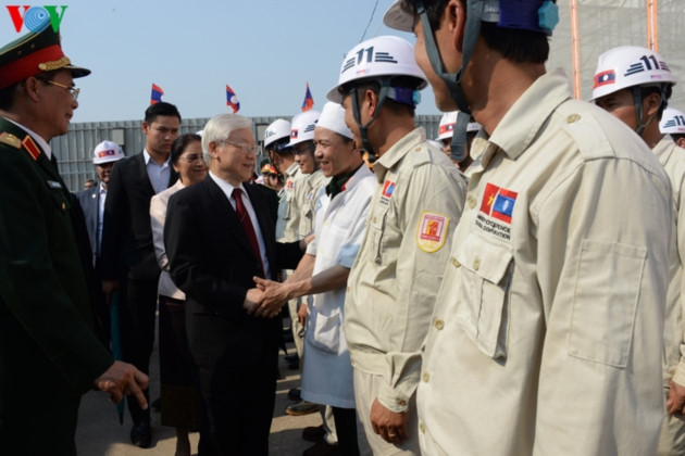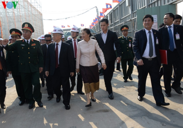 라오스 Pany Yathotou국회의장과 회견 마무리 이후 응우옌 푸 쫑 서기장-국가주석은 라오스 국회실 건설 현장을 방문하고 점검하였다.