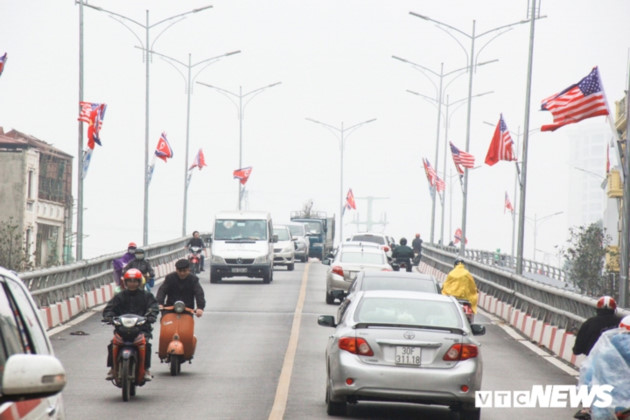 | 조선과 미국 국기가 하노이, 서호, 안쯔엉 다리 양쪽을 따라 걸려 있다. |
