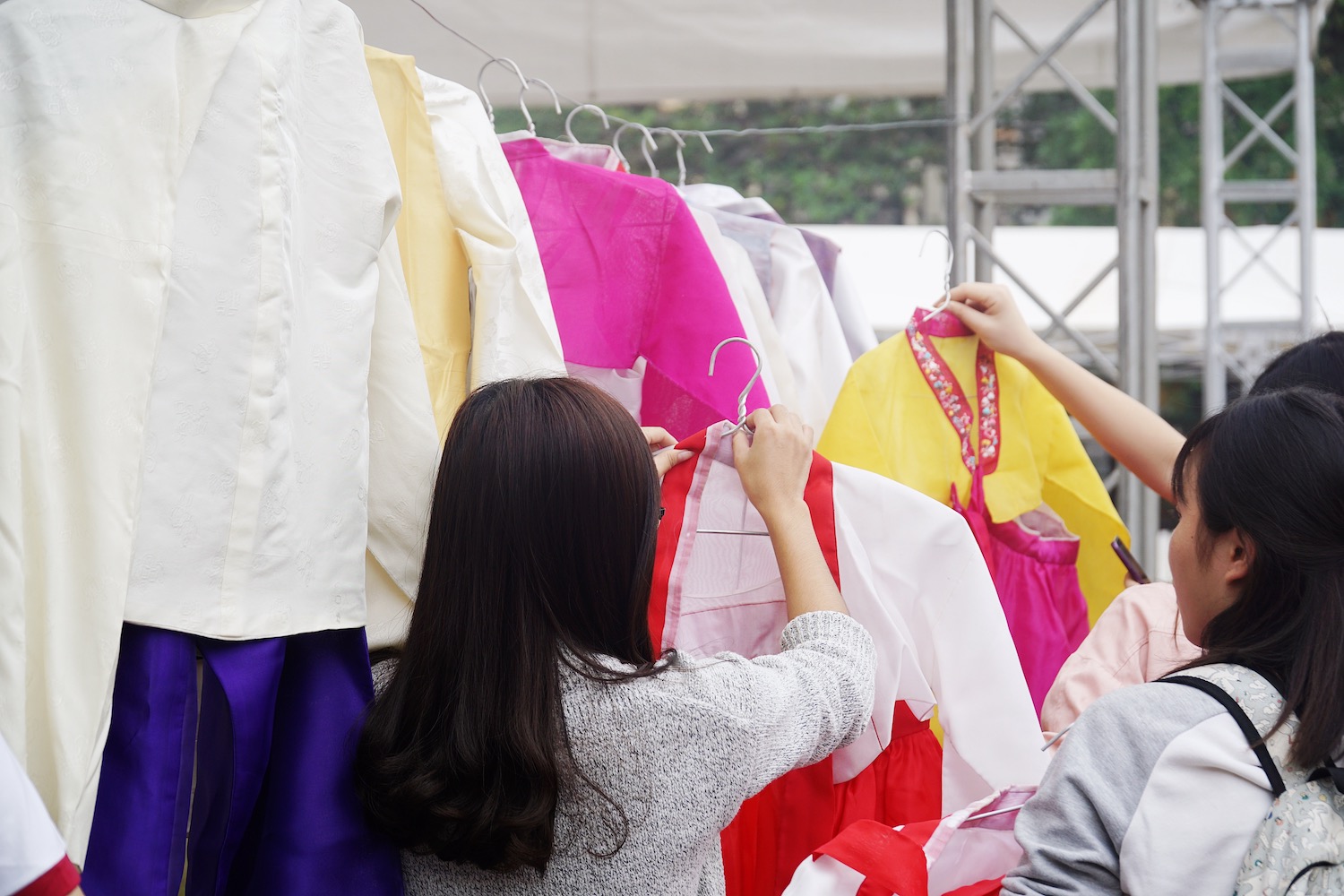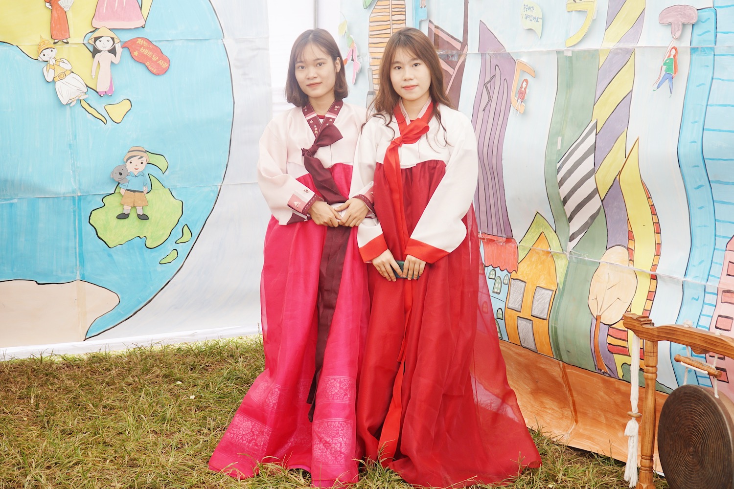 | 여학생들은 한국의 전통 의상인 한복을 입어 봅니다. |