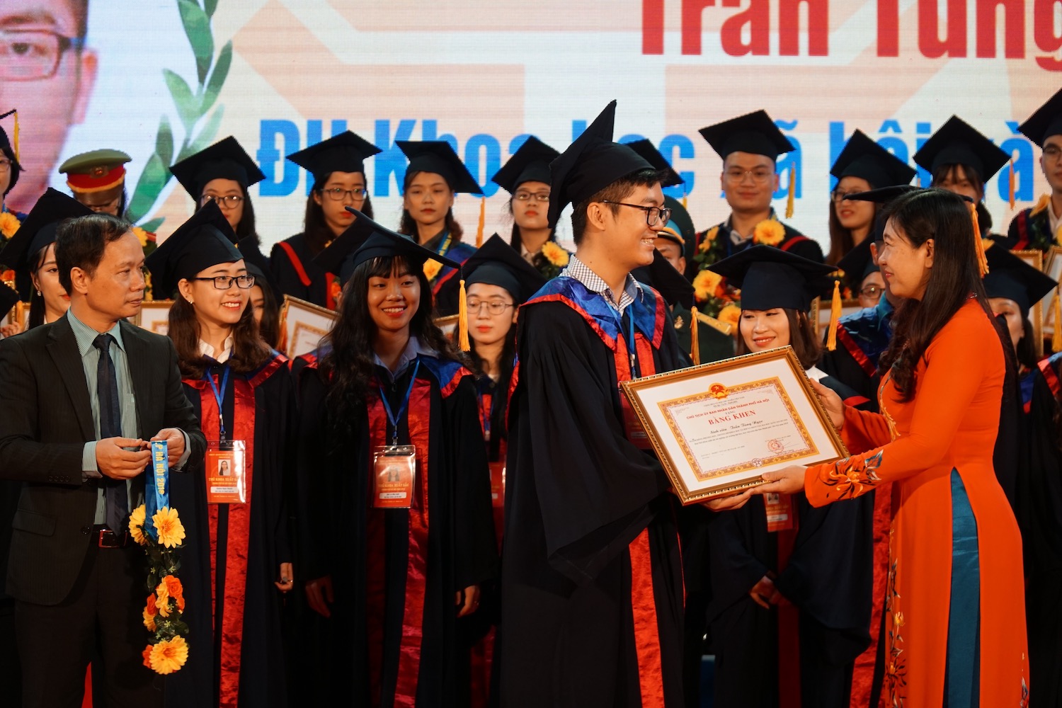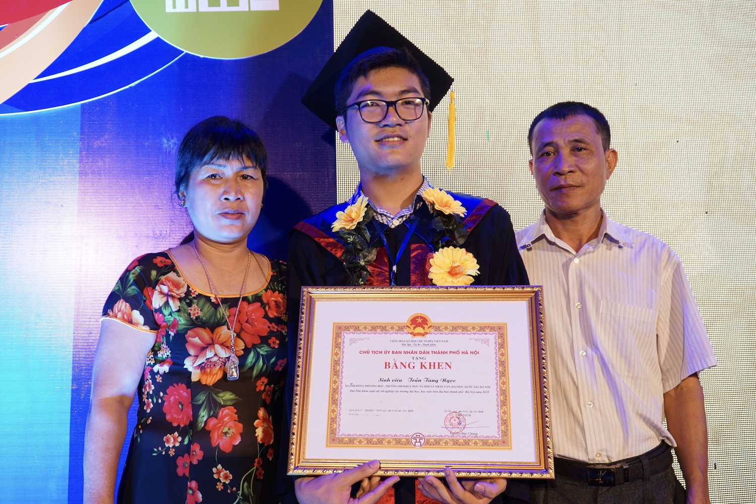 베트남 국영 라디오 한국어 방송 직원이자 국립대학교 – 인문사회과학대의 수석졸업생인 쩐 뚱 응옥 (Trần Tùng Ngọc)이 표창장을 받는 장면.