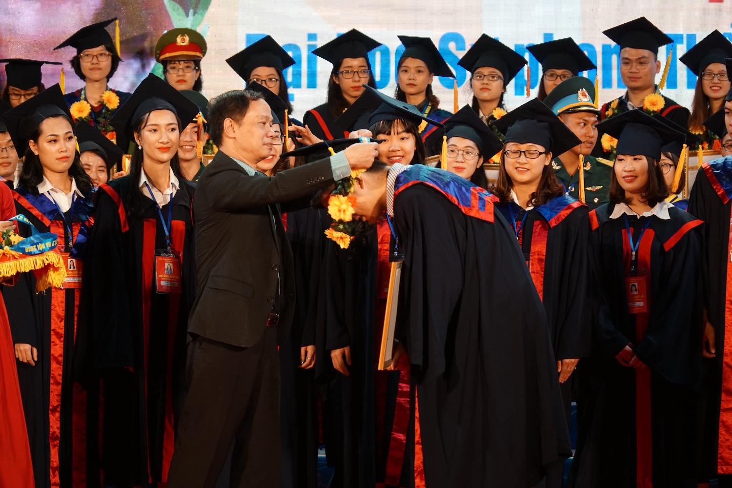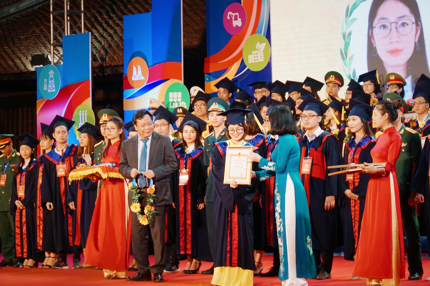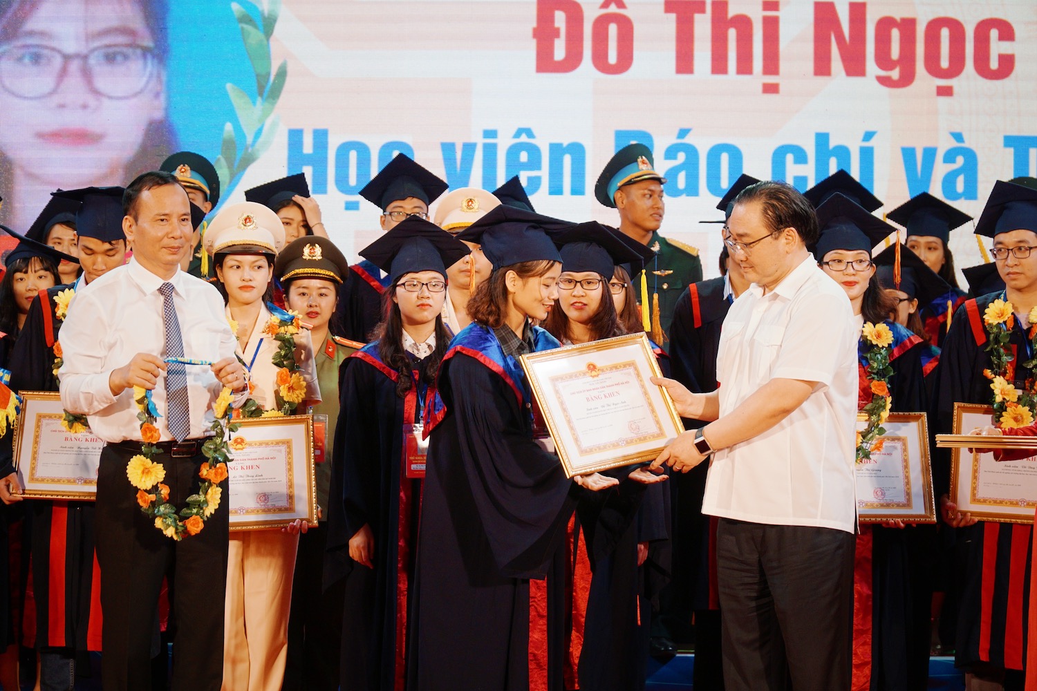 정치부 위원, 하노이 성위원회 비서인 황 쭝 하이 (Hoàng Trung Hải) 동지와 중앙민원위원회 부위원장인 응웬 남 (Nguyễn Nam)동지가 우수졸업생들에게 표창장을 수여하고 있다.