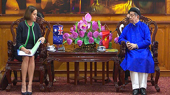“최근 아오자이는 외국인들에게 베트남 문화의 정체성을 보여주는 상징이되었다”고 응우옌 쑤언 화 연구원은 말한다. 트어티엔-후에성 인민위원회 판 응옥 토 (Phan Ngọc Thọ) 위원장은 2020년 7월 10일 주 베트남 호주 대사를 접견하는 자리에서 아오자이와 전통 머리 장식 칸쎕(khăn xếp)을 착용하고 있다. - 사진: thuathienhue.gov.vn |