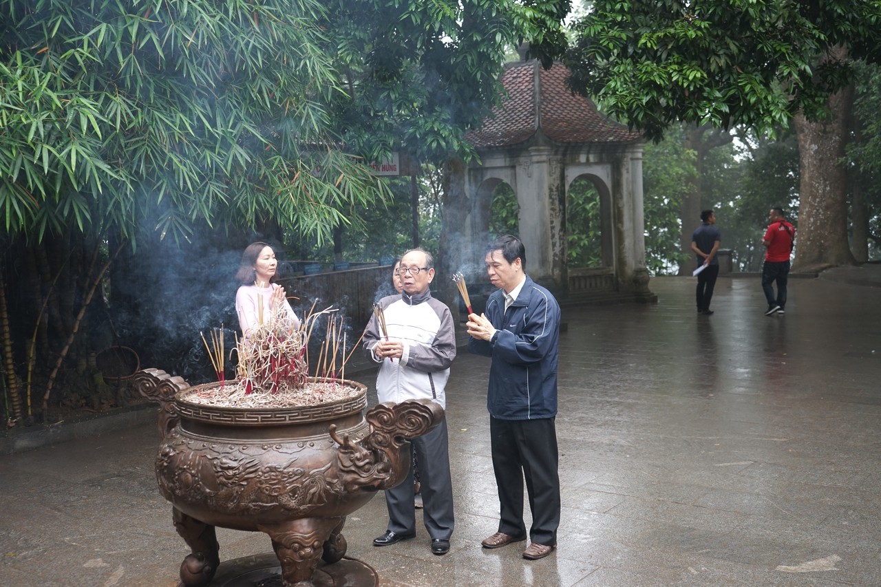 | 공식 축제가 아직 시작되지 않았지만 방문객들은 훙왕에 대한 존경을 표명하기 위해 향을 피우고 있다. |