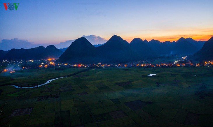 어두어져가면서 논밭과 마을은 신비롭고 낭만적인 조명으로 밝아진다.