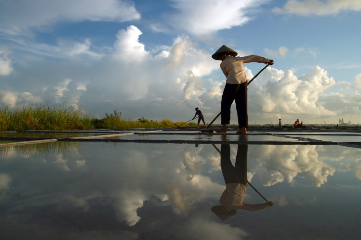 | 온도가 40도까지 올라가는 조건에서 일해야 되지만 Nam Dinh, Hai Hau현, Hai Dong읍 Xuan Ha마을 제염업자들이 하루 100,000동을 벌기 위해 새벽부터 일한다. |