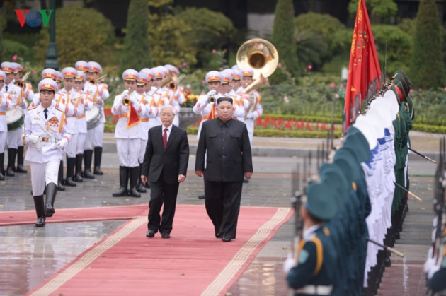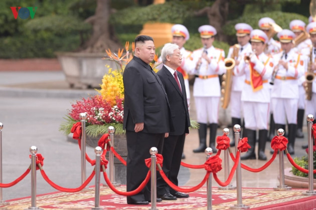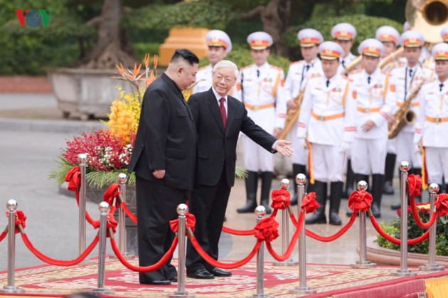 | 3월1일 오후, 수도 하노이의 주석궁에서 응우엔 푸 쫑 서기장 – 국가주석은 김정은 조선노동당 위원장의 환영식을 주재했다. |