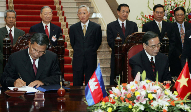 | 판 반 카이 (Phan Van Khai) 전 총리와 Samdech Hun Sen 캄보디아 총리는 2005 년 10 월 Hun Sen 총리가 방문했을 때 캄보디아와 베트남 국경 협정에 관한 추가 조약에 서명했다. (news.zing.vn) |