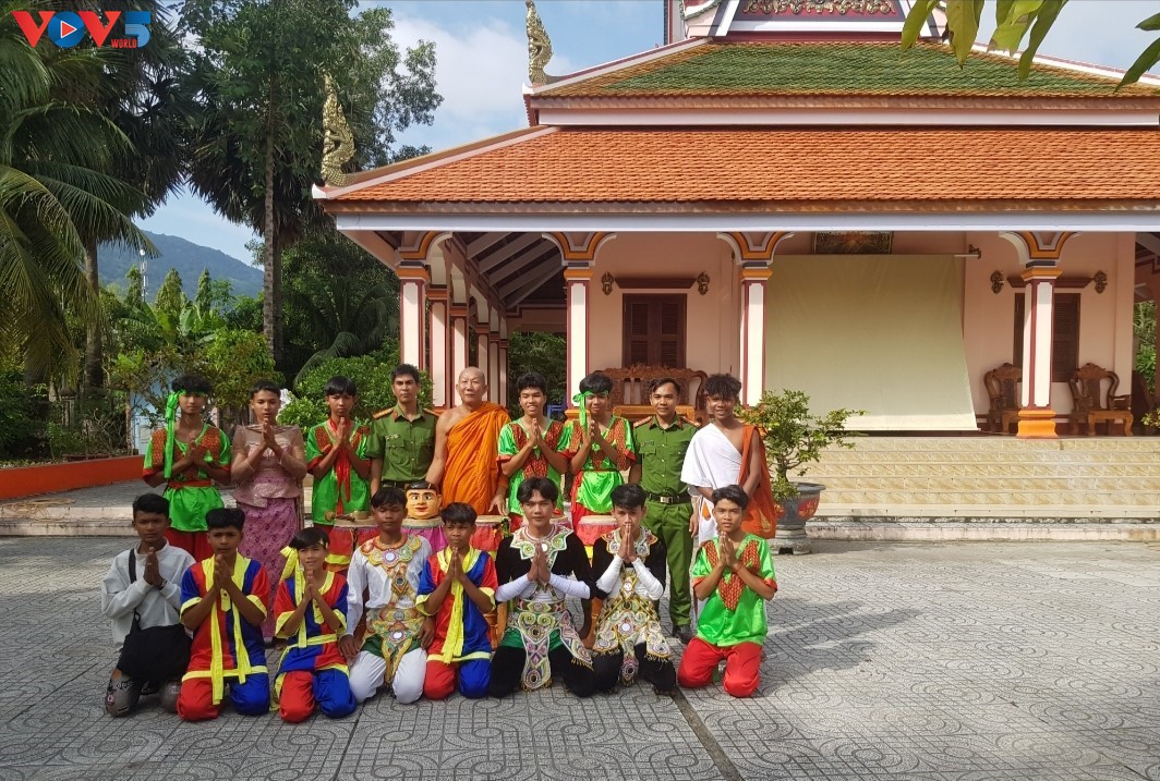 스나이존꿈 사원 쯔하이잠 북춤단이 스님과 경찰과 함께 기념 사진을 촬영하고 있다. (사진: 응옥 아인/VOV5) |