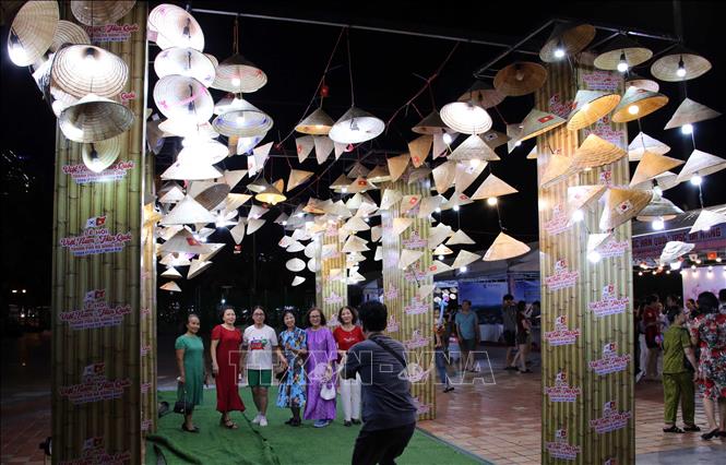 베트남 전통 모자인 논라(Nón lá) 공가에서 기념 사진을 찍는 관광객들 (사진: 베트남 통신사)