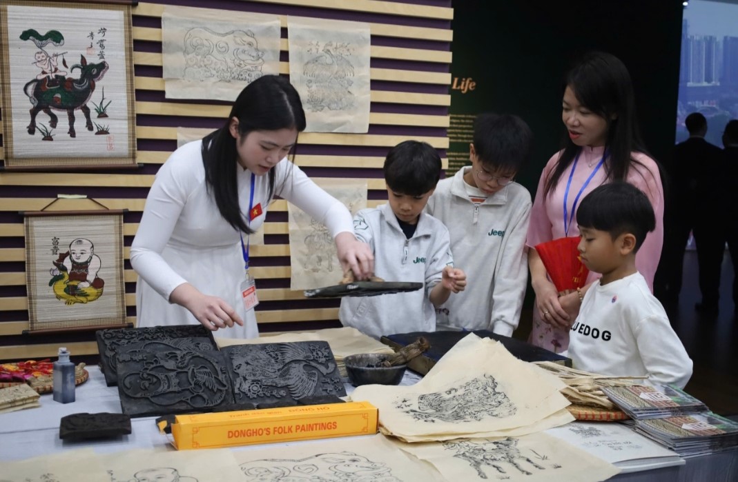 동호(Đông Hồ) 판화 만들기를 체험하는 어린이들 (사진: 베트남 민족학박물관)