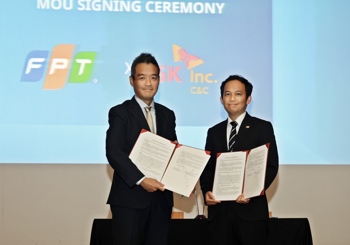 글로벌 디지털 ESG 사업 협력 MOU' 체결식에서 SK C&C 김민혁 글로벌 사업단장(왼쪽)과 FPT IS 쩐 득 찌 광 부사장이 기념사진을 촬영한 모습. [사진: FPT 제공] |