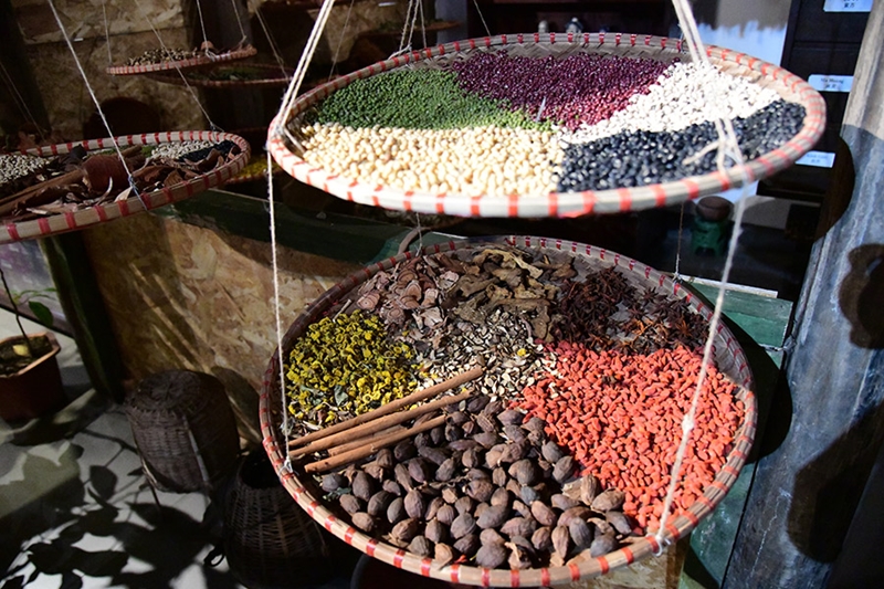 럼니: 구체적으로 이번 행사에서 여러분은 한약 제조 공간을 구경하실 수 있습니다. 이 공간에는 우리가 사극 드라마에 종종 볼 수 있는 네모난 약봉지와 고풍스러운 목재 약장을 보실 수 있습니다. 또 육계, 당귀, 팔각, 사인, 고지 등과 같은 한약재들이 봉지에 담겨 가게 문 위에 있는 대나무 막대기에 달려 있는 것도 보실 수 있습니다.