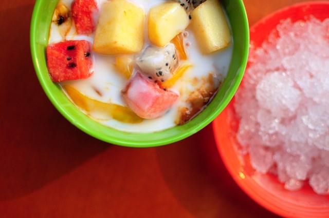 깔끔하게 준비된 과일에 취향에 따라 요거트, 캐러멜, 크림을 섞어 먹습니다. 모든 신선한 열대 과일이 토핑으로 들어갈 수 있습니다.