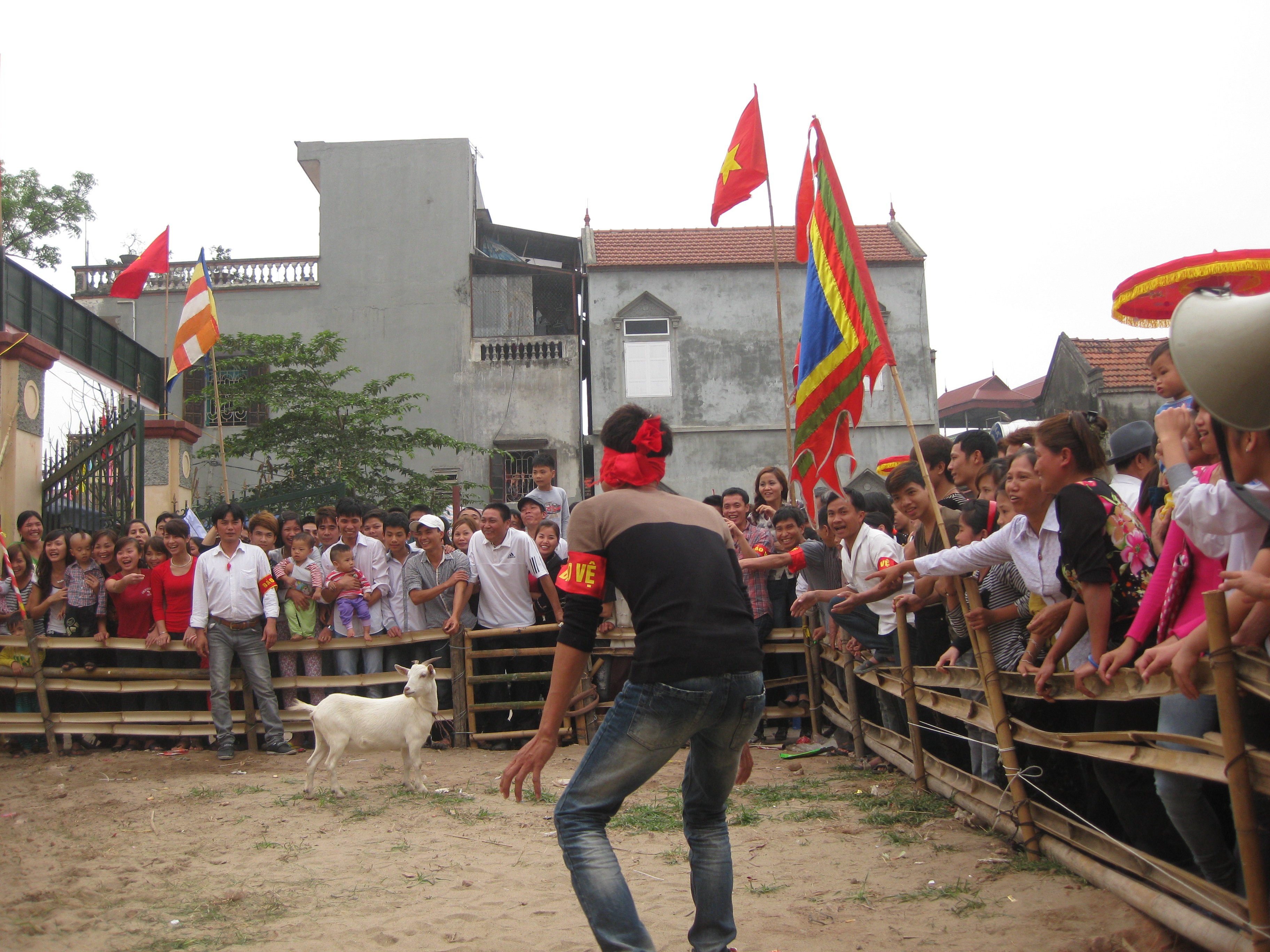 A: Another popular folk game in Vietnam is ‘Bịt mắt bắt dê’ or “catching a goat while blindfolded”. After a whistle is blown to start the game, there is shouting and applause for the blindfolded player trying to catch the goat as he runs around inside a fenced enclosure.