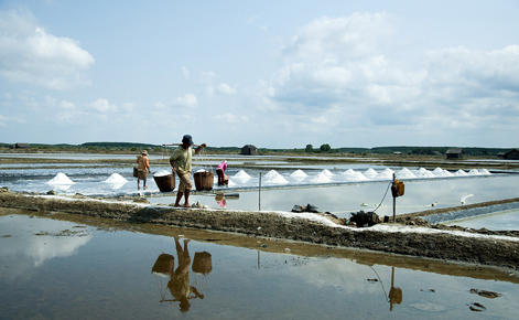 A: Vietnam has many salt-making villages along its 32,000 km coastline. Salt making is much harder than farming. Each year, salt farmers work only in the sunny summer months. First, they dig a pond on the shore to catch sea water. Beside the pond they level two areas, the first one is 15 cm higher than the second one. Both areas are divided and damned up into rectangles 4m x 10m.