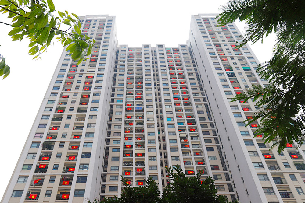 People living in apartments hang the national flag to congratulate Vietnam's containment of the Covid-19 pandemic and celebrate the 45th anniversary of National Reunification. |