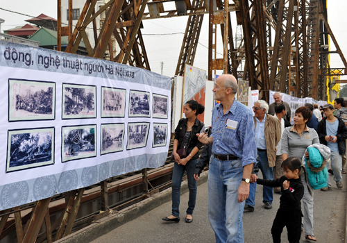 | Visitors to an exhibition organized on the walking side of Long Bien bridge |