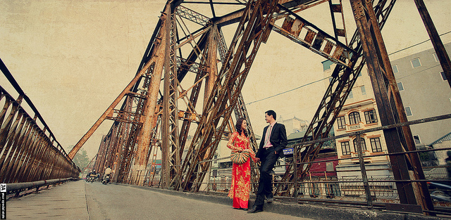 A: Today, Long Bien is just one of five bridges that cross the Red River in Hanoi. Many people say Long Bien bridge is the best place to watch the sunrise or the sunset and take nice photos of the sandbar. Lots of brides and grooms choose Long Bien Bridge as a nice background for wedding photos. Youths take photos on the bridge and camp on the river bank or on sandbar covered with lush greenery.