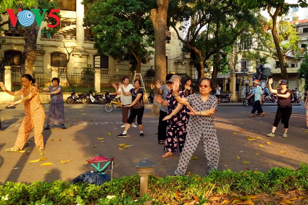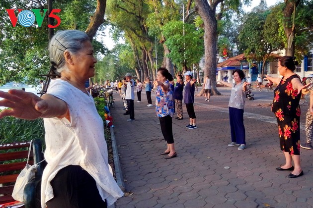 In the early morning, a lot of people do exercise around the Hoan Kiem lake in Hanoi. (photo: VOV)