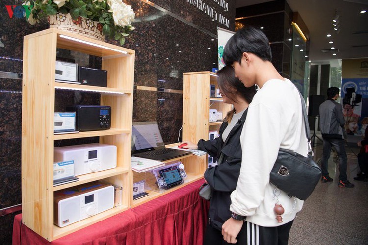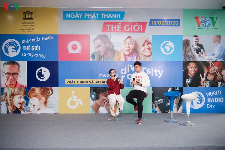 B: On the sidelines of the ceremony, themed “Radio and Diversity”, a booth showing off new media technology attracted many visitors, who sat down with VOV staff and tried their hand at radio broadcasting.