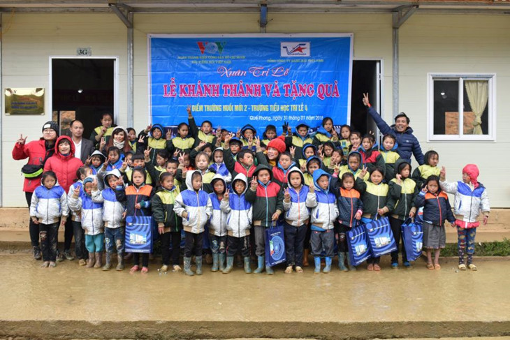 B: VOV’s Youth Union and Vietnam National Shipping Lines (Vinalines) gave Tet gifts to50 children at Huồi Mới 2 primary school, Nghe An province. It’s one of 6 schools that VOV and Vinalines helped build in 2016.
