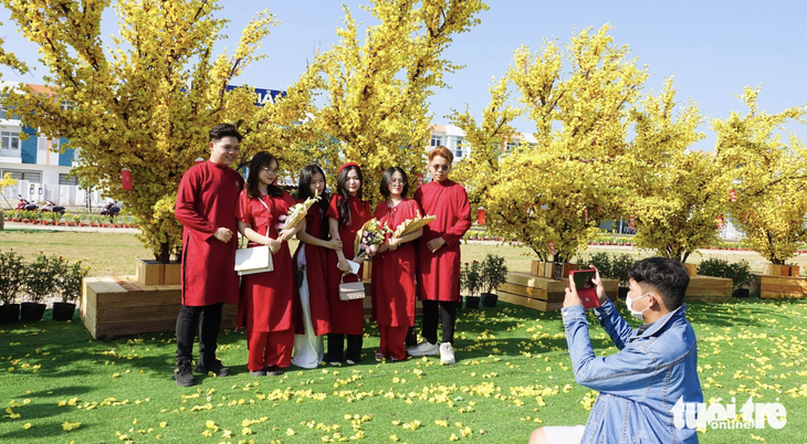 Young people in ao dai (Vietnamese long dress) pose for photos along an apricot blossom street in Kien Giang Province, southern Vietnam. (Photo: Chi Cong/Tuoi Tre) |