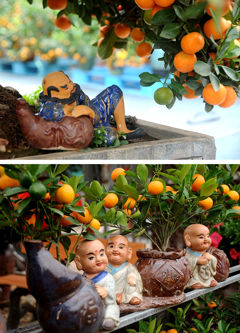 B: Large kumquat trees require year after year of meticulous care and careful tending so that they bear fruit just in time for Tet. Mini bonsai kumquat trees grown in small pots are popular because they’re sized for a small apartment or office.